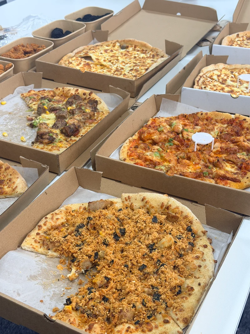 पिज्जाका बक्सहरूले टेबुलहरू भरियो, र कार्यालय तुरुन्तै स्वादिष्ट सुगन्धमा बेरिएको थियो। थकान केही बेरमै गायब भयो । सहकर्मीहरूले आफ्ना मनिटरहरूमा हेरे, आँखा उज्यालो। कसैले चिच्यायो, "पिज्जा यहाँ छ!" र त्यस्तै, सम्पूर्ण टोली वरिपरि भेला भयो।